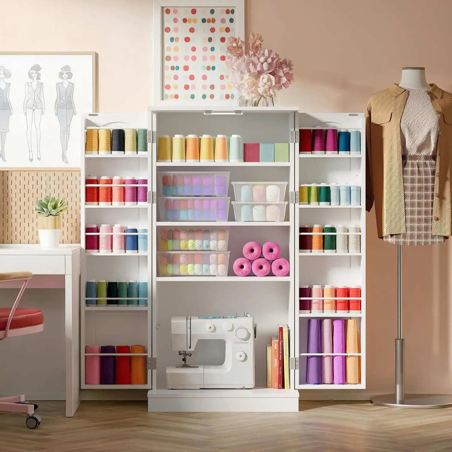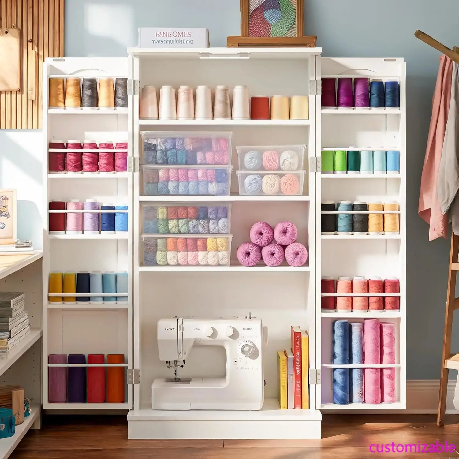 - Adjustable Sewing Cabinet with LED Lighting: Features customizable shelves in your craft storage cabinet, complete with energy-efficient LEDs - transforming into both a sewing storage organizer and display space for ongoing projects