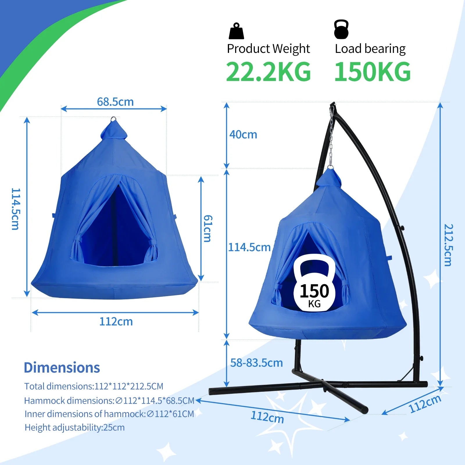 【X-BASE DESIGN】 Hanging tent with stand base adopts a cross design. X-shaped base (44X44inch) has a larger contact area with ground and can help disperse the gravity of the hammock. There is a triangular reinforced support between the 83.7- inch-high column and the X-shaped base, which makes the connection between the base and column more tight and firm.