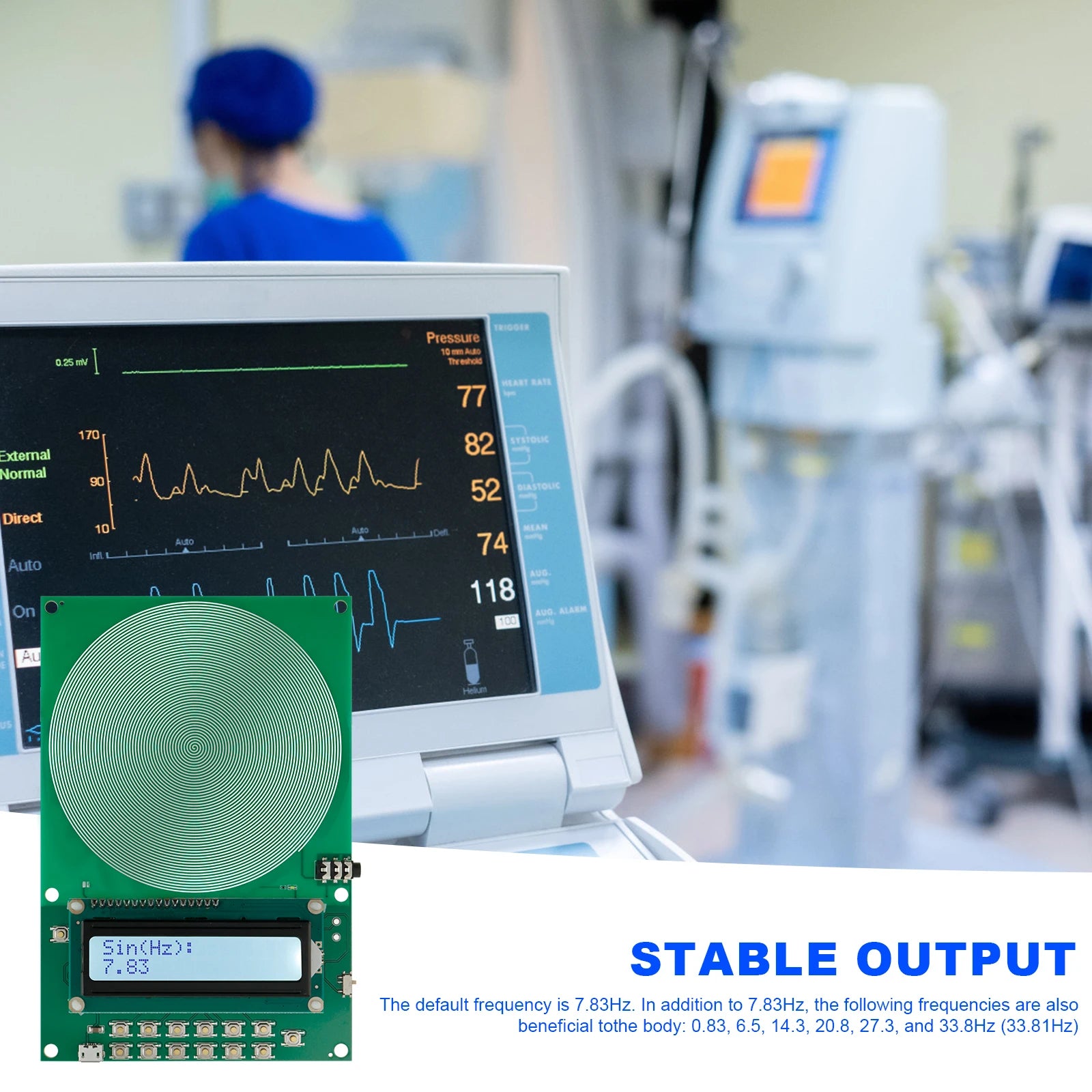 The default frequency is 7.83Hz. In addition to 7.83Hz, the following frequencies are also beneficial to the body: 0.83, 6.5, 14.3, 20.8, 27.3, and 33.8Hz (33.81Hz)